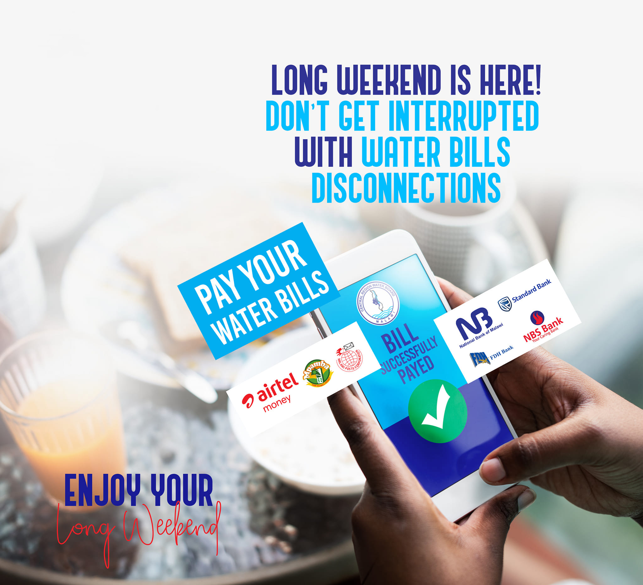 You can also pay your bill through TNM Mpamba and Airtel Money. In the following areas we also receive through Post Offices; Linthipe, Mitundu, Madisi, Kochilira and Kamwendo.